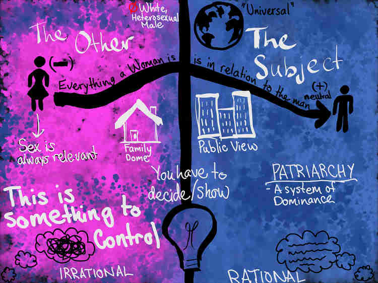 So with this particularity in mind, I don’t think it odd to begin with authors like Simone de Beauvoir’s (=SB), Genevieve Lloyd (GL), Luce Irigaray (LI) and Marilynn Frye (MF), women who take seriously the construction of the history of ideas from the site of dominating and repressing the Other, the so-called overcoming of the animal/nature in man, the irrational, the multiplicity, the messy, the chaotic. Unlike those who are regulated to the sphere of the natural, the domestic, the emotional, the dependent, men can be neutral, objective, rational, political, free and independent and as such the ideal human is a man.