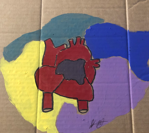 Painting by student who identifies as a white cis male He expressed during class discussion, that the conditions of patriarchy leave men, like himself, with a dark whole in their hearts.